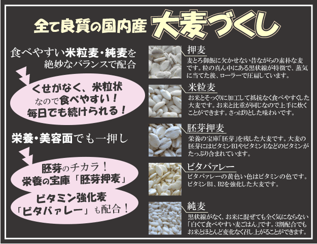 5種類全て国内産大麦を原料としています国産大麦5種ブレンド!【食べやすさへの秘密】純麦・米粒麦が絶妙な割合でブレンドされているから!【栄養へのアプローチ】食物繊維はもちろんのこと、ビタミンが豊富なビタバァレー 栄養の宝庫である胚芽を残した胚芽押麦もブレンドされています!押麦麦とろご飯に欠かせない昔ながらの素朴な麦です。