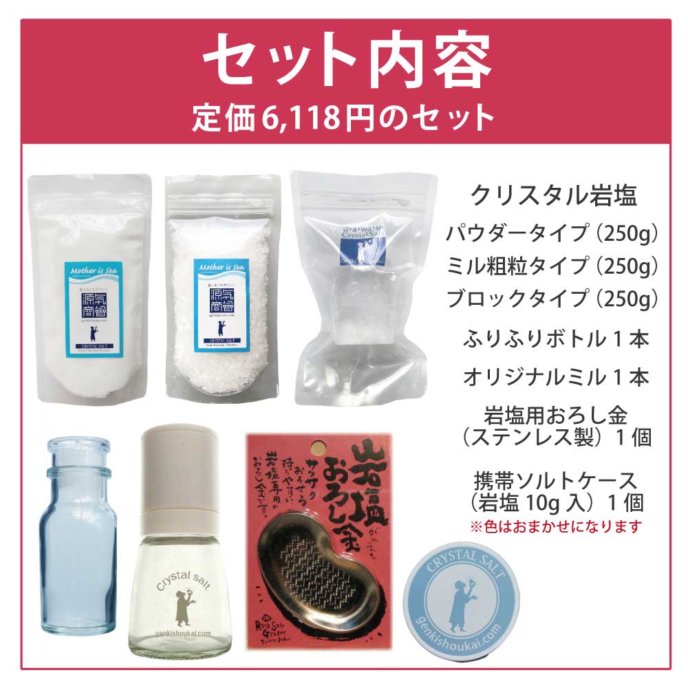 岩塩 食用 クリスタル岩塩 オリジナル お得な送料無料のセット | 源気商会 パウダー ミル粗粒 ブロック ふりふりボトル ソルトミル 岩塩用おろし金 携帯ソルトケース