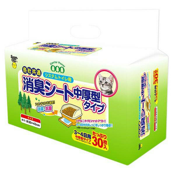 スーパーキャットの一覧はこちら各社共通システムトイレ専用シート!イヤなニオイをシャットアウト!!3〜4日分のおしっこをしっかり吸収!!消臭・抗菌成分フィトンチットエキス配合!!たっぷり長持ち30枚入り!!□材質:表面材:不織布、吸収材:綿状パルプ・高分子吸収材、防水材:ポリエチレンフィルム、結合剤:ホットメルト粘着剤、消臭剤:フィトンチットエキス□パッケージサイズ:260×155×240mm□1枚当たりのサイズ:約30×43cm(外寸)□重量:750g□原産国または製造地:中華人民共和国JANCD:4973640001897【銀行振込・セブンイレブン(前払)・ローソン、郵便局ATM等(前払)・ペイジー】決済予定のお客様へ当商品は弊社在庫品ではございません。